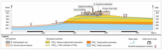 To represent the real subsurface conditions, the well-known Cisternone’s cavity located in the first layer of anthropogenic material within the San Giustino Square was considered in the section (Figure 4).