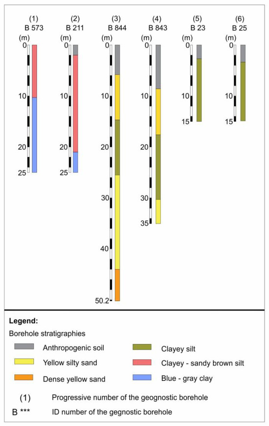 Interpretated geognostic boreholes located along the cross-section used for the reconstruction of the 2D subsoil model. For the ubication of the geognostic boreholes see Figure 1.
