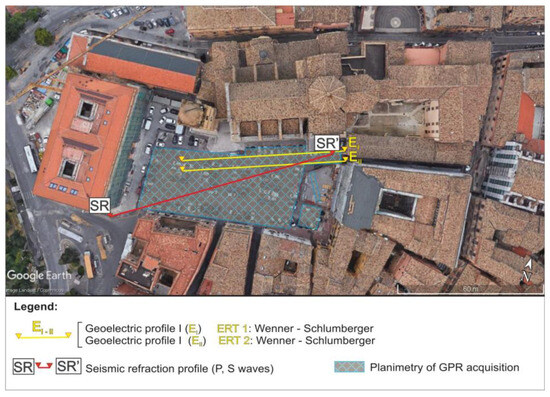 Seismic refraction tomography (SR) and Ground-Penetrating Radar (GPR) acquisition were carried out in San Giustino’s Square in 2018 (Figure 6) as part of the subsoil characterization for the renovation of the Square [48]. Later on, two geoelectrical acquisitions (ERT) were performed [50] to study the local seismic response of San Giustino’s Square considering the anthropogenic cavities.