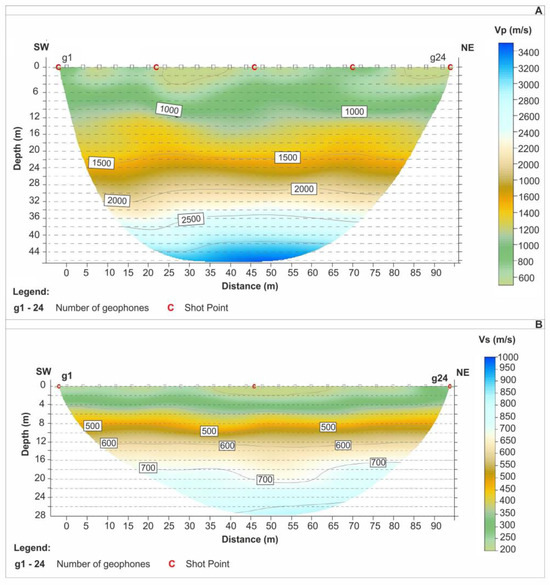 The subsurface structure, the velocity distribution in depth, and the number of underlying layers can be detected by performing seismic refraction tomography [51] in P and S waves (Figure 7). A seismic array of 96 m with 24 geophones was used to investigate in the ENE–WSW direction the areal surface of the square (see Figure 6).
