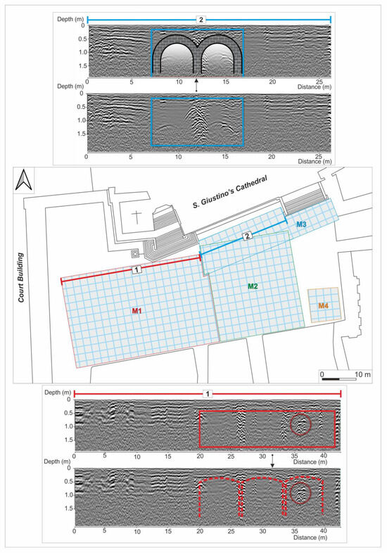 The GPR revealed an ancient network of underground utilities and several significant areal anomalies found in the investigation meshes named M1 and M3, respectively (Figure 8). Within the M1 area, an A1 anomaly at the cathedral staircase has been highlighted. This anomaly could be due to the presence of an underground cistern with interconnected vaults at distances of approximately 5 m for a total of 20 m long anomaly.