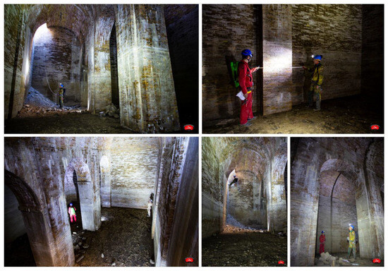 It is worth noticing, between the two barrel-vaulted, arches, that are supporting structures, identified as metric-sized columns (Figure 8). These dimensions were confirmed in 2018 during an inspection inside the cavity by some members of the Speleological Association named “SpeleoClub Chieti” (Figure 9).