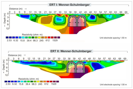 ERT represents the most used geophysical method for investigating cavities and other types of discontinuities in the subsoil because of its inexpensive survey costs and the large resistivity contrast between the surrounding formation and the air-filled hypogea environment [55].