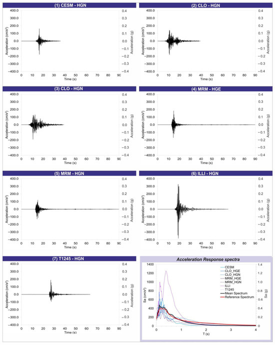 For instance, at point P140, where the Court building is located, the acceleration spectrum peak is at 0.2 s with 1.15 g and at 0.3 s with a 0.8 g spectral acceleration. It implies that the damage suffered by this building could be due to the resonance between the building’s fundamental period (Tf) and the ground amplified periods. Considering Equations (1)–(3), respectively, we can estimate the following values for the Court building with H = 21 m [46]: 0.36 s, 0.50 s and 0.40 s.