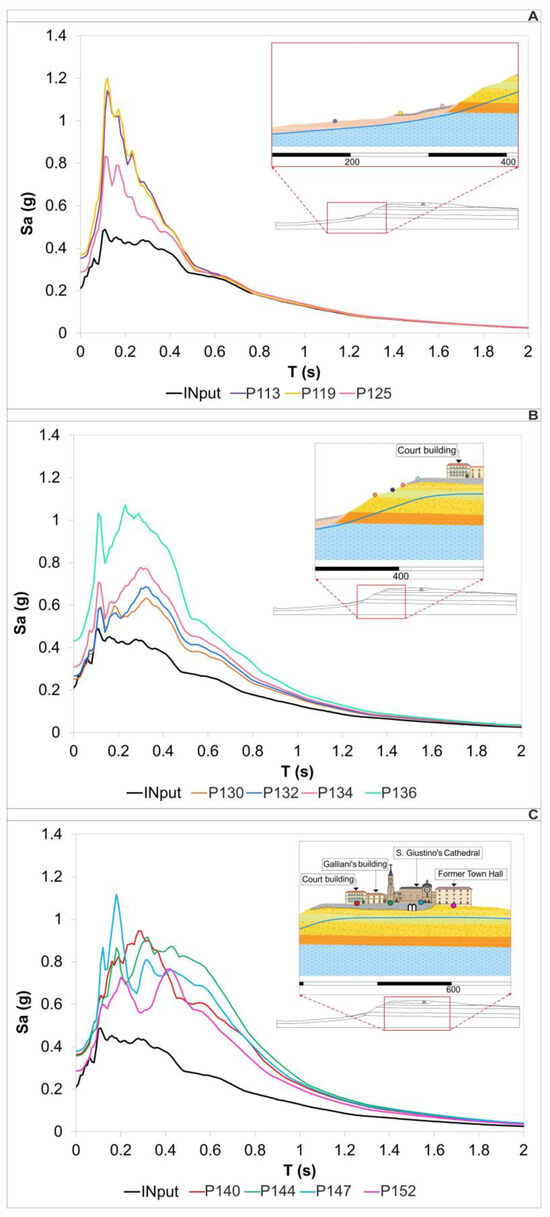 Finally, the contribution of the cavity named “Cisternone” was considered on the spectral acceleration values at some points near the Former Town Hall and San Giustino’s Cathedral.