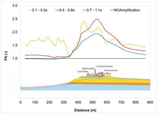 Looking at Figure 15, the trend of the FA changes passing from the slope to the crest: alongside the slope, the highest FA (about 1.8) is related to the period range 0.1–0.5 s while, in San Giustino’s Square, the highest values of FA (2.5) fall in the range 0.4–0.8 s at San Giustino’s cathedral and in the range 0.1–0.5 g at the Court building. This evidence confirms a differentiated possible damage based on different period range of amplification along the Square. Furthermore, the reason for minor damage suffered by the Cathedral and the Former Town Hall could be related to the complex geometry both in-plane and in section and longer fundamental periods than 0.8 s for both buildings. However, the possible 3D seismic shaking response of both structures could have prevented them from large damage. It cannot be caught by a 2D numerical simulation, and it is beyond the scope of this study.