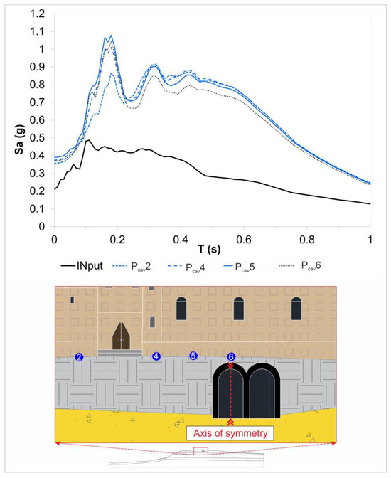 In this study, the maximum spectral acceleration (1.1 g) was found at a distance of 6 m (Pcav5) from the cavity axis (Figure 16). This is confirmed by the parametric study by [4] carried out in Chieti’s center: the maximum amplification is moved away from the cavity axis of 1.5 L, where L is the cavity width. The deamplification induced by the cavity above its axis (control point Pcav6) is evident compared to the acceleration spectrum calculated at Pcav5, as shown by the decrease in spectral acceleration values.