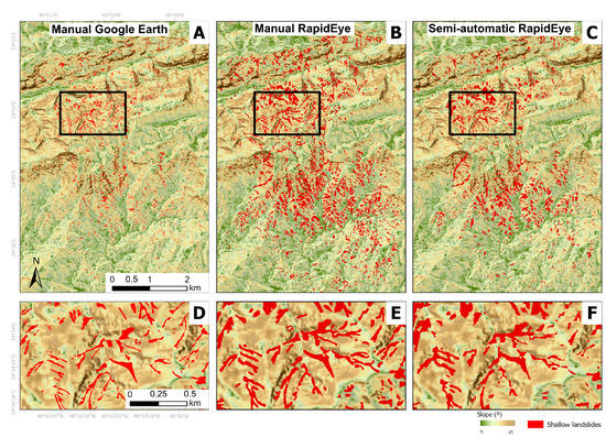Figure 2. Inventories used as input to produce shallow landslide susceptibility maps: (A) manual—Google Earth images; (B) manual—RapidEye satellite image; (C) semiautomatic—RapidEye satellite image; (D) zoom of A; (E) zoom of B; and (F) zoom of C.