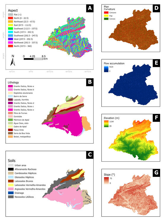 Figure 3. Thematic variables: (A) aspect; (B) lithology; (C) soil; (D) plan curvature; (E) flow accumulation; (F) elevation; and (G) slope.