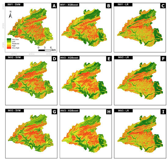 Figure 4. Susceptibility maps constructed based on three algorithms: (A) INV1 SVM; (B) INV1 XGBoost; (C) INV1 LR; (D) INV2 SVM; (E) INV2 XGBoost; (F) INV2 LR; (G) INV3 SVM; (H) INV3 XGBoost; and (I) INV3 LR.