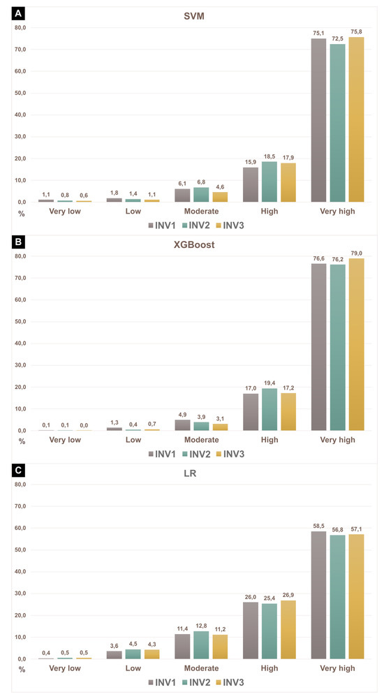 Figure 5. Presence of shallow landslide scars in each susceptibility class for different input inventories and models: (A) SVM; (B) XGBoost; and (C) LR.
