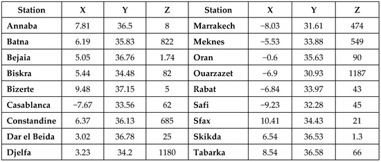 Statistical–mathematical data on precipitation quantities cover a period of more than 50 years of measurements (1970–2023) from 29 stations (Figure 1). These 29 stations were chosen according to the availability of annual precipitation data in our climate database and also according to the access to more recent data for free download on climate data sites. This choice was not determined by the representativeness of specific climatic zones. The spatial distribution of these stations nevertheless allowed us to cover the entire study region well. All these data came from reliable sources and did not require corrections; only the missing data were replaced by the average of the series studied or the average calculated by the values of the previous year and the following year of the missing value. The choice to use monthly precipitation data for the stations of Csablanca, Dar El Beida, and Tunis was directly linked to the availability of monthly rainfall data for free download on the site (https://climexp.knmi.nl/start.cgi, accessed on 18 November 2024). These monthly data were used only for the study of wavelet coherence.