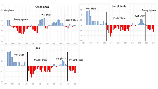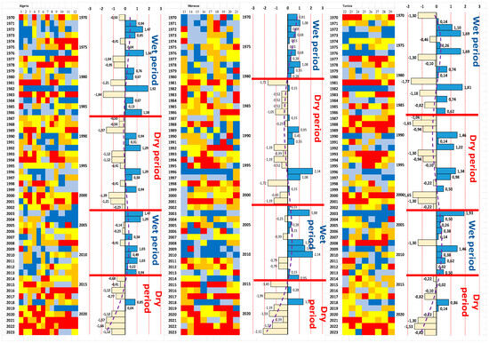 - A first wet period, more homogeneous for the precipitation series in Morocco (1970–1980), while in the other two countries, it appears longer and is noted between 1970 and 1986 in Algeria and between 1970 and 1987 in Tunisia.