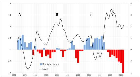 The negative phase is observed when these pressure centers simultaneously weaken in intensity. The trajectory of atmospheric depressions is shifted toward the south. The Mediterranean basin and the Maghreb regions find themselves under the influence of atmospheric disturbances that create more precipitation in these regions. In Figure 3, we note a close link between the variability of the regional precipitation index and the variability of the NAO index, observed over the periods 1972–1978 A–1979–2002 B, 2003–2012 C, and 2013–2022 D, the drought period, precipitation recovery period, and a new drought phase.