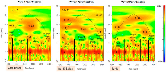 In Casablanca, seasonal modes weaken during drought cycles at the same time there is a strong variance in interannual variability modes (1–2, 2–4, and 6–8 years) during wet cycles. The dry period is marked by the strengthening of a decadal mode (8–14 years) that begins in 1985 and ends in 2005. The multidecadal mode (16–32) is more pronounced at the beginning of the studied period. In Dar El Beida, the seasonal mode weakens during the dry period (1987–2002). It is reinforced by an interannual mode (4–8 years), including the last dry years of the series (for this period, we also note the strengthening of the decadal mode of 12–18 years). During wetter periods, the interannual (1–2, 2–4, and 6–8 years), decadal (8–16 years), and multidecadal (16–32 years) variability modes are more reinforced. In Tunis, rainfall variability is close to that of Dar El Beida. The seasonal mode weakens during the dry cycle (1985–2002); it is reinforced by the 8–16-year decadal mode. The interannual variability modes (2–3, 3–6, and 6–8 years) are more present during wet periods.