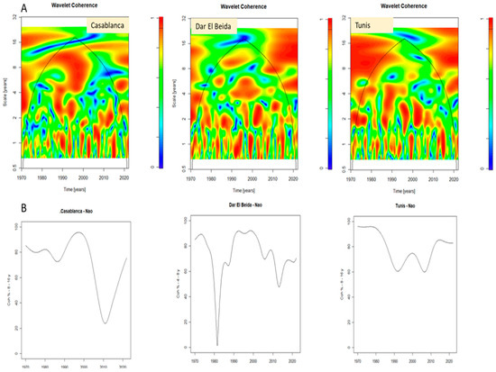 Wavelet coherence analysis between average monthly rain in Casablanca, Dar El Beida, and Tunis, and Northern Atlantic Oscillation (NAO) values: (A)—Wavelet Coherence; (B)—NAO values.