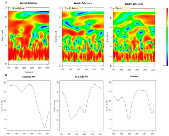 Wavelet coherence analysis between average monthly rain in Casablanca, Dar El Beida, and Tunis, and MOIs (Mediterranean Oscillation Indices). (A)—Wavelet Coherence; (B)—MOI values.