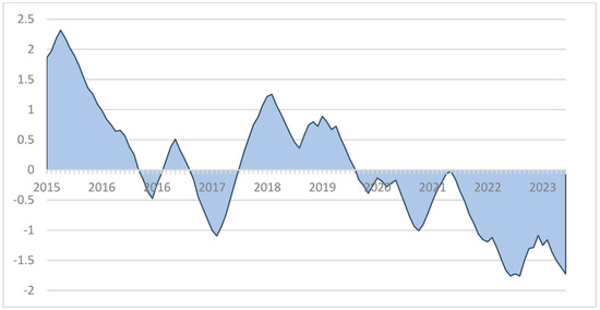 Monthly water volumes in Morocco’s reservoirs between January 2015 and December 2023 (centerd reduced difference) (source: General Directorate of Hydraulics), http://maghreb-assoudoud.water.gov.ma/fr/site/today, accessed on 20 September 2024.