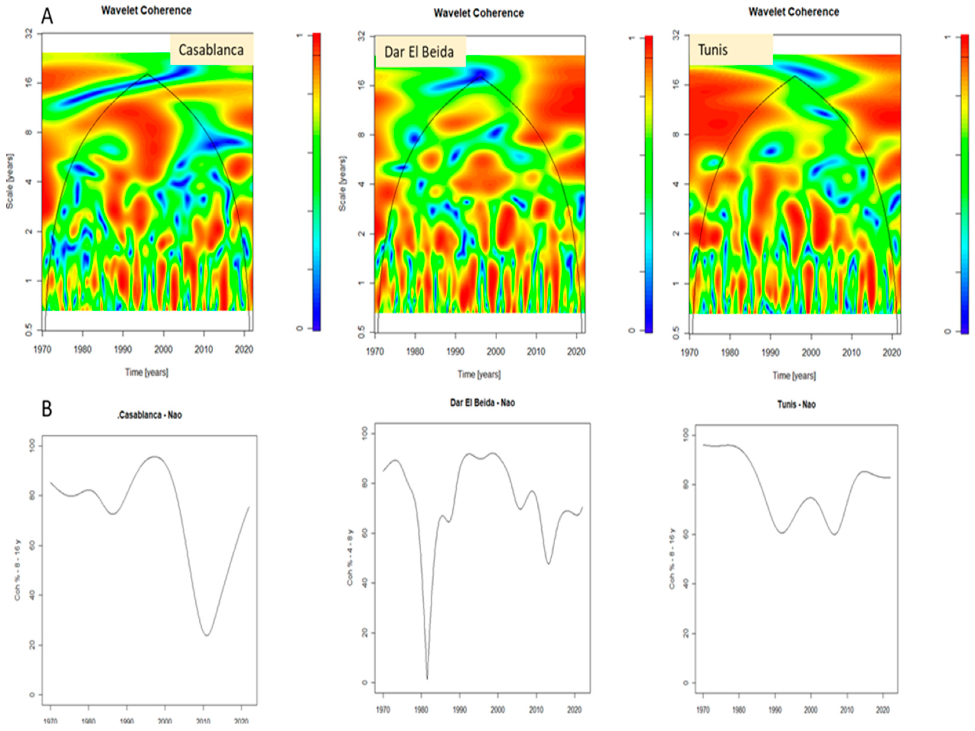 - Zamrane, Z.; Mahé, G.; Laftouhi, N.-E. Wavelet Analysis of Rainfall and Runoff Multidecadal Time Series on Large River Basins in Western North Africa. Water 2021, 13, 3243. [Google Scholar] [CrossRef]