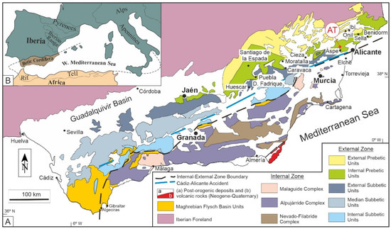 - Vera, J.A. Geología de España. Sociedad Geológica de España; Instituto Geológico y Minero de España: Madrid, Spain, 2004; 884p. [Google Scholar]