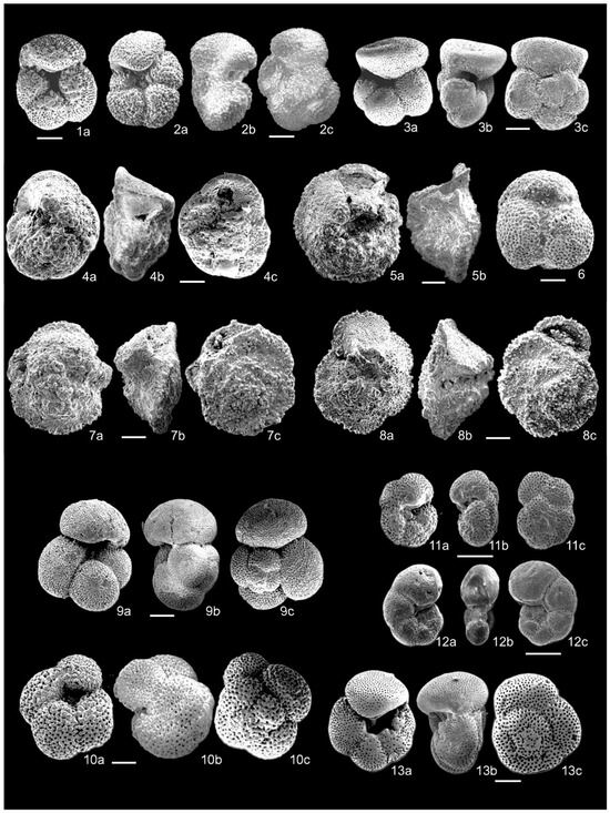 - Pearson, P.N.; Olsson, R.K.; Huber, B.T.; Hemleben, C.; Berggren, W.A. Atlas of Eocene Planktonic Foraminifera; Cushman Foundation for Foraminiferal Research, Special Publication: Glen Allen, VA, USA, 2006; Volume 41, 514p, ISBN 9781970168365. [Google Scholar]