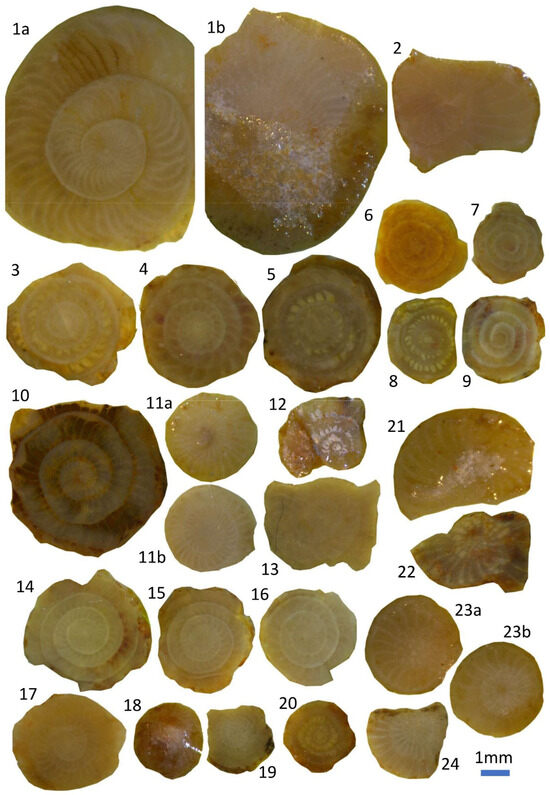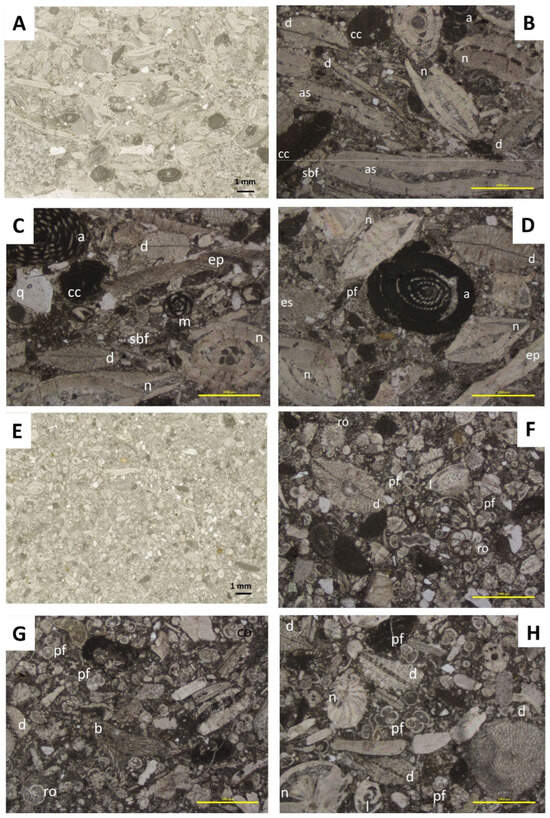 - Laboratory analyses concerned microfacies, biostratigraphy, and bio-chronostratigraphy based on planktonic foraminifera, calcareous nannoplankton, and LBF. For the Eocene biostratigraphy, the following zonations were used: (1) planktonic foraminifera [29,30,31]; (2) LBF, the Shallow Benthic Zones (SBZ) [32]; and (3) calcareous nannoplankton [33]. The formal names of the taxa cited throughout the text are compiled in a taxonomic appendix added in Supplementary Materials. Analysis of microfacies was carried out by the study of standard thin sections (2.0 × 3.0 cm), following the methodology of Flügel [34], where the percentages of fossil abundance were evaluated by point counting on the thin sections. The identification of larger foraminifera was performed following Loeblich and Tappan [35], where the genus Assilina includes both Assilina s.s. and ‘operculiniform Assilina’, as defined by Tosquella and Serra-Kiel [36]. Systematics of nummulitids is mainly based on Hottinger [37] and Schaub’s [38] works. Paleobathymetric reconstructions of the LBF are mainly based on Hottiger [39], Baceta and Mateu-Vicens [40], and Mariani et al. [41]. Processed and illustrated studied samples, with their sampling numbers, are stored and available for future research in the Ecology and Geology Department of the University of Málaga (planktonic foraminifera) and in the Earth Sciences Department of the University of Huelva (LBF).