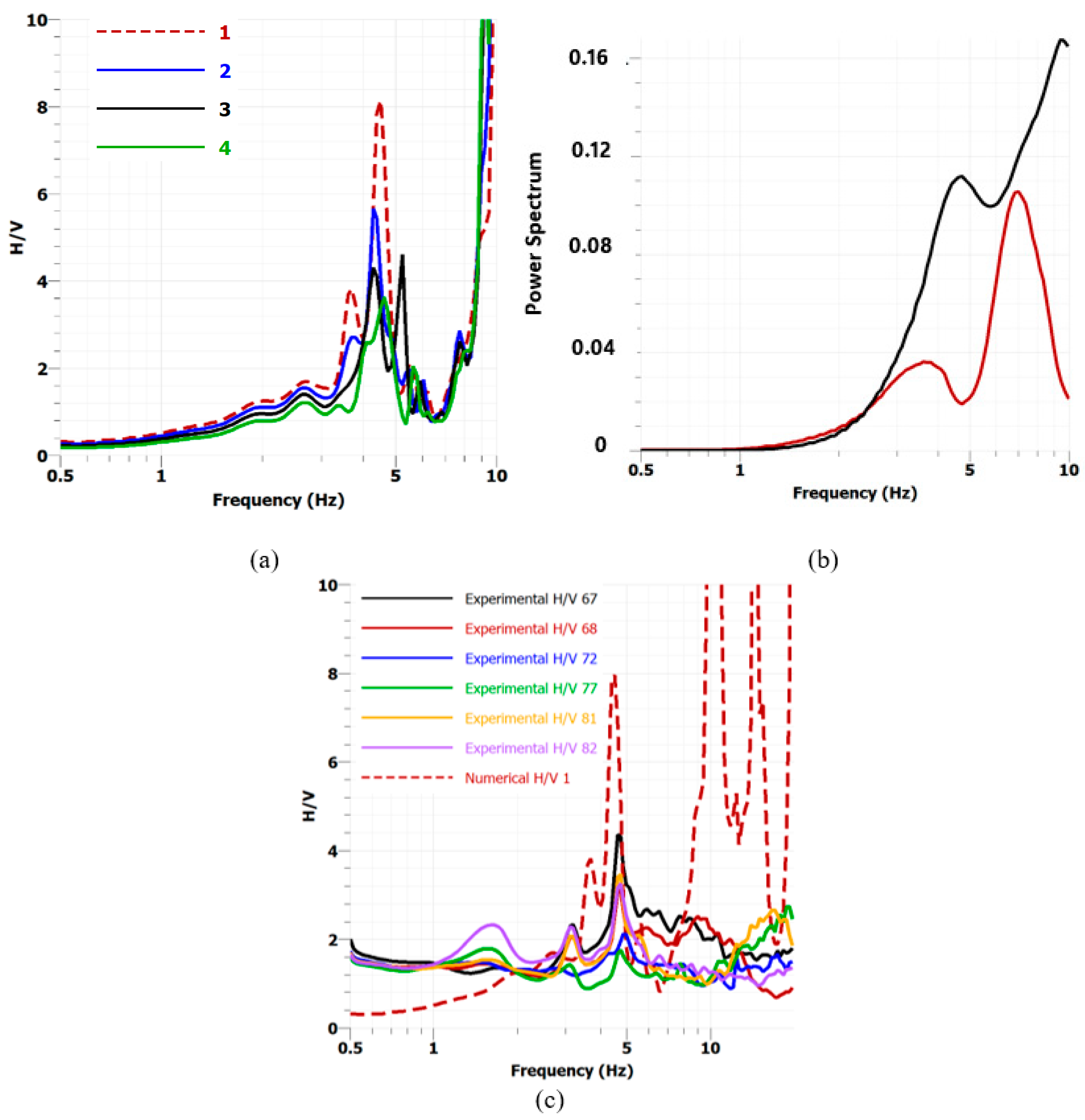 5.4. Experimental Horizontal-to-Vertical Spectral Ratio of Microtremors (HVSR) or (H/V)