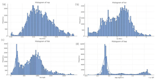 A preliminary analysis was conducted on the gathered measurements of MWD measurements (rate of penetration, torque, flow outback pressure, and bit axial pressure) acquired from drill sensors to establish an understanding of the data’s distribution and frequency of occurrence. Various influences, such as irregularities in machinery, driller proficiency, drill bit wear, and the subterranean characteristics, among others, have been identified as potential contributors to observable differences in rop and the fob [46]. Hence, it is possible that a univariate study alone may not adequately capture the nonlinear relationships that exist between the MWD responses and geotechnical classification characteristics. Consequently, a multivariate analysis using all MWD response variables was employed to maximize the prediction performance of the ML models.