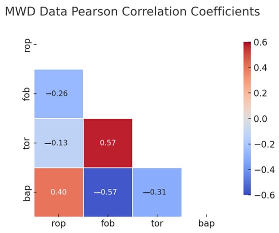 The observations of MWD data distributions suggest diverse data behaviors, underscoring the need for the careful and nuanced analysis of the relationships between variables. As a result, a Pearson Correlation Coefficient plot for the MWD data is displayed in Figure 3. For instance, the correlation between fob and tor is approximately 0.57, indicating a very weak positive linear relationship. However, only linear relationships are displayed, which may not capture more intricate, nonlinear relationships between variables. The presented data correspond to the merged dataset after applying KNN to integrate exploration hole geotechnical observations with blast drilling measurements. The original raw resource-development data were independently logged before this merging process.