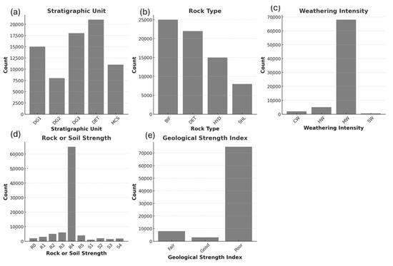 Furthermore, the distribution within the rock type aligns with the observed pit geology, where HYD zones and SHL are less frequent compared to the BIF and DET categories (Figure 4b). Conversely, the skewed distributions in weathering, rock or soil strength and GSI are consistent with the predominant features of the pit’s BR geology, specifically favoring the MW, R3, and poor categories (Figure 4c–e, respectively). Such a pronounced skewness towards a single category might influence the efficacy of predictive models, especially when these models rely on a limited set of infrequent categories for training and validation.