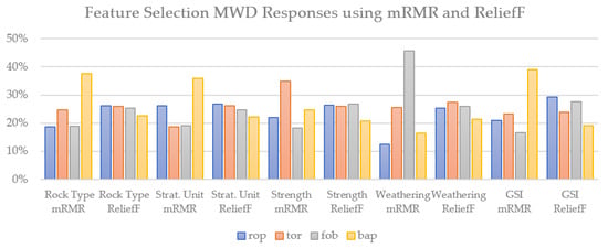 The feature selection algorithms MRMR and ReliefF were applied to the four MWD response features to evaluate their significance in predicting the following five geotechnical categories: rock type, strat. unit, strength, weathering, and GSI. The percentages presented were calculated by dividing the score of each MWD response in an experiment by the total of the four MWD responses in that respective experiment (Figure 5).