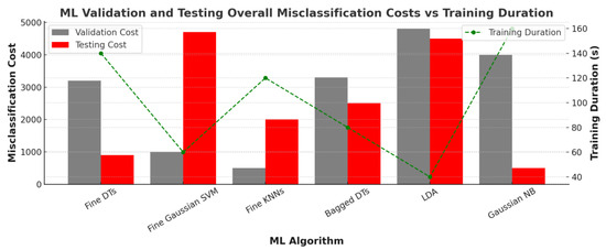 However, the reduced training time for LDA did not translate to higher accuracy or lower costs than those of KNNs (Figure 6). In terms of OMC, the fine KNNs model displayed the strongest performance versus training duration. For all five geotechnical classifications, KNN consistently showcased the lowest validation and testing costs. On the other hand, NB and LDA models had higher validation costs despite shorter training times.