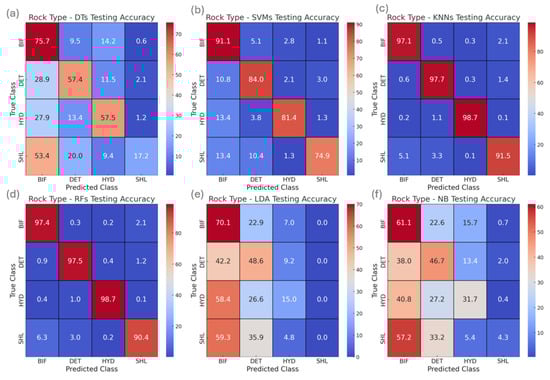 Confusion matrices showing testing accuracies (%) for rock types using (a) DTs, (b) SVMs, (c) KNNs, (d) RFs, (e) LDA and (f) NB.
