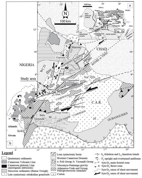 Based on petrological and isotopic data and according to [,], the NCAB in Cameroon used to be divided into three geotectonic domains: (i) The southern Cameroon domain or Yaoundé domain [] that lies between Congo craton to the south and the Sanaga shear zone (SSZ; Figure 1b) to the north. Ref. [] fixed the actual northern limit of the domain at the Ngoro–Belabo shear zone, situated north of Bafia locality (see Figure 15 in []). (ii) The Central Cameroon domain, also known as Adamawa–Yadé domain [], cross-cut by the CCSZ, is located between the SSZ to the south and the Buffle Noir Mayo Baléo (BNMB) shear zone, also known as the Tcholliré–Banyo shear zone [], to the north. (iii) The northern or western Cameroon domain that is separated from the Central Cameroon domain by the BNMB shear zone in its eastern part (Figure 1b).