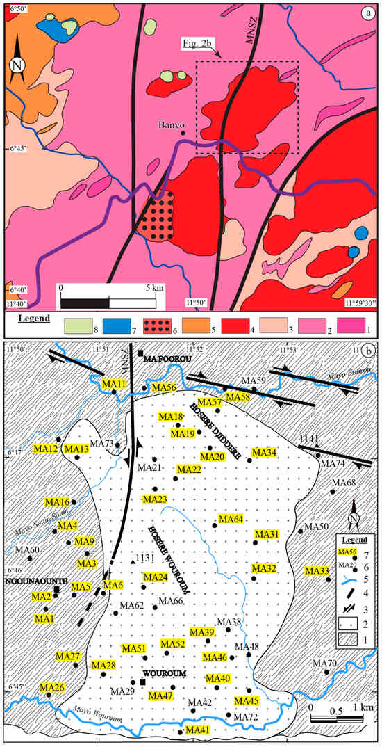 - Koch, P.; Weecksteen, G.; Jacques, E.M.; Chaput, M. Carte géologique de reconnaissance du Cameroun, Feuille Banyo N° NB 32 NE-E41, avec notice explicative. Direction des Mines et Géologie de l’Afrique Equatoriale Française et du Service des Mines du Cameroun. 1952. Available online: https://search.worldcat.org/fr/title/Carte-geologique-de-reconnaissance-du-Cameroun-1:500-000.-Feuille-NB-32-NE-E41-Banyo/oclc/492383088 (accessed on 23 February 2025).