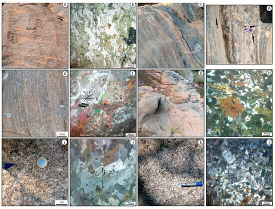 Outcrop photographs and photomicrographs (plane-polarized light) of the studied rocks. (a,b) Banded hornblende–biotite gneiss; (c–f) banded garnet–biotite gneiss developed in the high-strain mylonitic zone; (g,h) diorite; (i–l) coarse-grained granite. Note in (l), the zonation of plagioclase crystals.