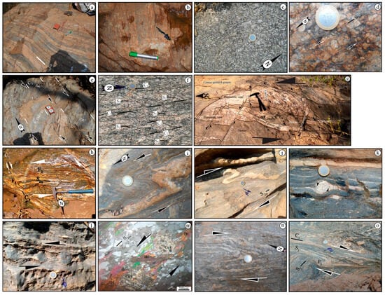 C3 shear planes are ductile bands of high-strain rock recorded in banded hornblende–biotite gneiss and banded garnet–biotite gneiss. They are marked by either (i) narrow shear corridors about 50 cm wide, in the NE-SW direction, that cross-cut the N-S-oriented S2 foliation in dextral sense of shear movement (Figure 4o) or (ii) discrete planes that show a NW-SE direction (N150° E) where the metamorphic foliation of the country rock curves progressively to become parallel to the shear plane direction (Figure 4h).