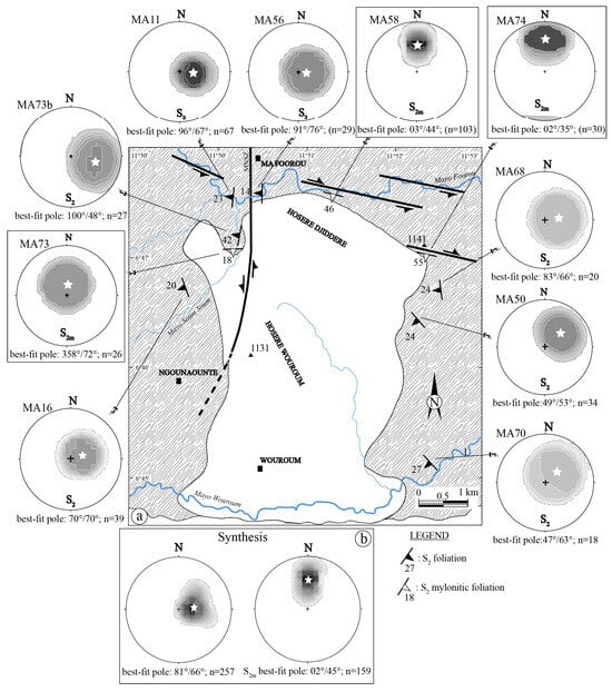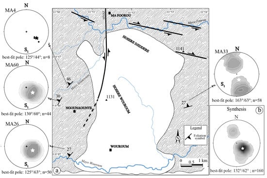 The D1 deformation is recorded in banded hornblende–biotite gneiss from Ngounaouté and Mayo Soum-Soum. It is a flat layering S1 foliation marked by the alternation of thick (pluri-decimetric) felsic (quartz- and feldspar-rich) bands with thick mafic (hornblende- and biotite-rich) bands superposed with the alternation of thin millimetric to centimetric dark bands and light bands (Figure 4a). In the lower-hemisphere projection diagrams, it is essentially NE-SW-oriented fabric with low to moderate dips (27–44°) in the western and eastern parts of the study area. The best-fit poles of the foliation (Figure 5a) vary between 130°/60° (i.e., 60°→130°; N40°E/30°NW; site MA60) and 163°/63° (i.e., 63°→163°; N73°E/27°NW; site MA33) with a maximum at 132°/62° (i.e., 62°→132°; N42°E/28°NW; Figure 5b).