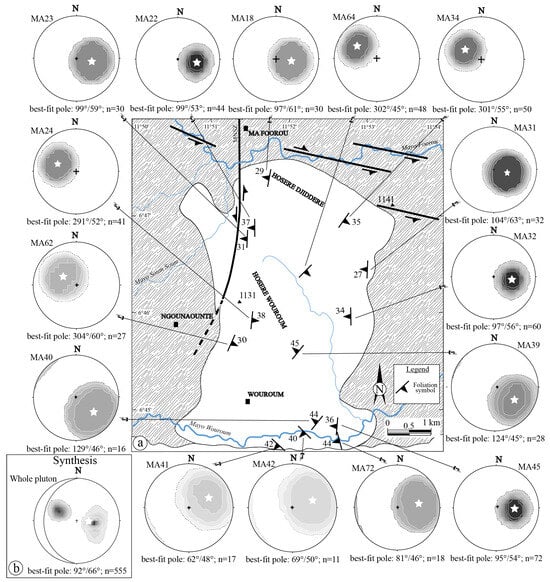 (a) Field structural map of study area showing magmatic foliations with their lower-hemisphere equal-area projection diagrams. (b) Synthesized lower-hemisphere equal-area projections diagrams (contour intervals = 2%). Star in the projection diagram indicates the best-fit pole.