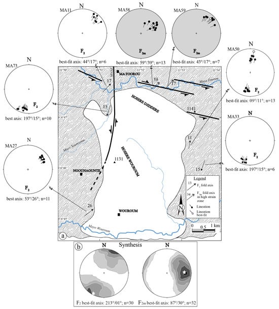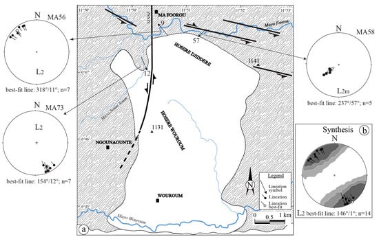 Petrographic and microstructural analyses, using a binocular microscope (plane-polarized light) hosted at the Soil Analysis and Environmental Chemistry Research Unit (SAERU) of the Department of Earth Sciences, University of Dschang (Cameroon), were performed on 25 oriented, thin sections, cut perpendicular to the foliation planes (XY) and parallel to the mineral stretching lineation (X; i.e., the XZ reference frame) as indicated by [,]. Statistical analyses of structural elements (planar and linear structures) were performed using Stereonet software v.8 [,]. Measurements of strikes, dips and/or plunges in structural elements were plotted in a lower-hemisphere projection diagram (contour intervals = 2%). In the overall view of the mean orientation of structural elements, such as foliations, mineral stretching lineations and fold axes, they were marked by their best-fit pole or best-fit line in the projection diagram using the conventional techniques of []. Detailed studies of structural elements in addition to mesoscopic to microscopic criteria of non-coaxial strain (e.g., fold asymmetry, boudins, shear bands, porphyroclast tails and pressure shadows) will allow us to propose a kinematic analysis and reconstruct the tectonic history of the study area.