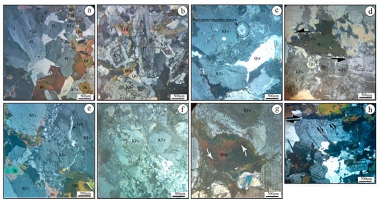 According to [,,,,,,], mesoscopic and microscopic rock fabric studies allow the determination different states of pluton deformation. Applied to the granitic pluton, oriented thin sections reveal deformation from a magmatic state to a solid state from high to low temperatures. The magmatic state of the granites is marked (1) at the mesoscopic scale by (i) the preferred orientation of the K-feldspar euhedral to sub-euhedral crystals and (ii) elongated fusiform-shape enclaves known as magmatic fabric that defines the magmatic flow and (2) at the microscopic scale by (i) the presence of sub-euhedral, coarse crystals that tend to be polygonal, exhibiting triple joins, (ii) quartz crystals showing homogenous (or weak undulose) extinction (Figure 10a), (iii) feldspar crystal zonation (Figure 10b) and (iv) small, euhedral, zoned, early-formed feldspar crystals hosted by late-stage anhedral feldspar crystals (Figure 10c). The sub-magmatic state deformation is marked by (i) the presence of myrmekite budding crystals on the border of K-feldspar crystals (Figure 10d) and (ii) feldspar porphyroclast micro-fractures filled up with quartz and/or feldspar crystals (Figure 10e) indicating, in this stage of deformation, the presence of at least a small quantity of silicate melts at the time of the fracture of the feldspar porphyroclasts. The solid-state deformation microstructures from high to low temperatures are marked by (i) cleavage and twin deformations (bending and kinking) in biotite and plagioclase crystals (Figure 10d), (ii) quartz crystals dynamically recrystallized with grains that show irregular and lobed boundaries, illustrating the grain boundary migration recrystallization (Figure 10c,e,f), (iii) quartz grain chessboard patterns, (iv) elongated quartz ribbons showing dynamic recrystallization with elongated sub-grain rotation (Figure 10d), (v) the presence of small recrystallized quartz grains and (vi) pervasive mylonitic deformation including biotite and hornblende fishes (Figure 10g) and microcracks in feldspar crystals, sometimes showing synthetic movement in the dextral sense (Figure 10h).