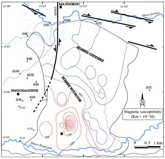 - Fozing, E.M.; Njanko, T.; Seta, N.; Kwekam, M.; Njonfang, E.; Rochette, P. Structural characterization of the Misajé granitic pluton (NW Cameroon): Constraints from magnetic and field observations. Int. J. Earth Sci. 2016, 105, 2285–2309. [Google Scholar] [CrossRef]