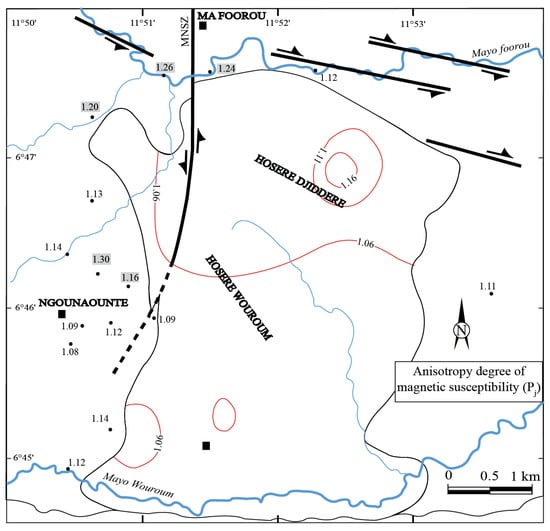 Anisotropy degree of magnetic susceptibility (Pj) isolines in the granitic pluton and value distributions in the country rocks. Shaded values indicate Pj values ≥ 1.20.