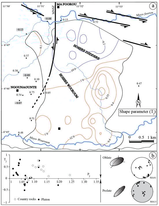AMS data per site are presented in Table 2. The magnetic susceptibility bulk magnitude (Km in 10−3 SI) in the study area (Figure 11) varies between 0.08 (sample MA13 from the pluton in the coarse-grained granite) and 10.6 (sample MA9 from the country rock). Km values range between 0.18 and 10.6 in the country rocks and between 0.08 and 4.8 in the pluton (in the diorite). In the country rock, 77% of the sites show a Km value > 0.5 while 87% of the sites from the pluton show a Km value ≤ 0.5. The three sites presenting a Km value > 0.5 over twenty-one AMS sites belong to the unmappable dioritic facies that outcrops in the central south of the pluton. Rocks showing Km values ≤ 0.5 range in the paramagnetic group, likely dominated by iron-bearing silicate signal such as biotite and hornblende, while those with Km values > 0.5 range in the ferromagnetic group, usually dominated by magnetite as magnetic susceptibility carrier []. There is no direct evidence for the attribution of the ferromagnetic component of susceptibility to magnetite, but the constant observation in similar plutons in the Neoproterozoic Central African Belt indicates that, when present, this component is carried by magnetite. Figure 11 shows the central southern part of the pluton as zone of high Km values (with the ferromagnetic zone where outcrops are unmappable (due to the outcrop width) dioritic facies) while the northern and eastern parts are of low to very low Km values. The paramagnetic behavior of granitic rocks from NE Banyo is confirmed by the hysteresis loops of the representative samples that show typical curves of paramagnetic behavior (Figure 12). The anisotropy degree of magnetic susceptibility (Pj) values vary between 1.01 (site MA41 from the pluton in diorite) and 1.30 (site MA6 from the country rock). It ranges between 1.07 and 1.30 in the country rock and between 1.01 and 1.20 in the pluton (site MA34 in the coarse-grained granite; Figure 13). Rocks showing Pj ≤ 1.20 display the fabric due to magmatic flow as magnetic fabric [] and are known as magnetite-free rocks [,]. In the pluton, there is no Pj value > 1.20, while in the country rock, Pj values > 1.20 are located in the northern, northwestern and western parts of the pluton, without specific organization. The shape parameter (Tj) ranges between −0.49 (sample MA19) and 0.80 (sample MA32) in the pluton in the coarse-grained granite within the study area (Figure 14a). It ranges between −0.13 and 0.75 in the country rock and between −0.49 and 0.80 in the pluton. In the granitic pluton, the constricted AMS ellipsoids are essentially located in the northern part of the pluton where they seem to be influenced by the N-S (Mayo Nolti) and WNW-ESE shear zones. The Tj value isoline within the granitic pluton (Figure 14a) shows a zonation of the pluton with the northern part as a zone of Tj < 0 (with the constricted AMS ellipsoid) while the southern part is dominated by Tj > 0 (with the flattened AMS ellipsoid). The isoline −0.05 works well with the N-S Mayo Nolti shear zone. Furthermore, the Tj vs. Pj diagram (Figure 14b) indicates that most of the sites are plotted in the field of oblate shape of the deformation ellipsoid with 67% for the pluton and 73% for the country rock. Thus, flattening and constriction played important roles during the emplacement and deformation of the pluton.