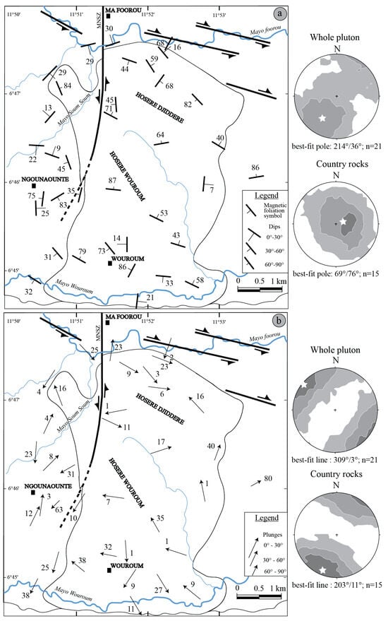 Section 4.2 described three deformation phases recorded in the study area: D1, D2 and D3. The ductile D2 deformation phase is recorded both in the country rocks and the pluton and displays the following geometric parameters: (i) S2 magmatic foliation with mostly N-S to NW-SE strike and low to moderate dips with a best-fit pole at 92°/66° (Figure 7); (ii) S2 metamorphic foliation with NW-SE to N-S strike and low to moderate dips with a best-fit pole at 81°/66° (Figure 6); (iii) NW-SE-oriented L2 mineral stretching lineation with low to moderate plunges in the country rocks with a best-fit line at 146°/01° (Figure 8); and (iv) NNE-SSW- to NW-SE-oriented F2 fold axis with low to moderate plunges with a best-fit axis at 177°/17° (Figure 9). The magnetic fabric in the NE Banyo granitic pluton displays magnetic foliation with N-S to NW-SE strike and moderate to high dips and N-S and mostly NW-SE magnetic lineation with low plunges. The magnetic fabrics of the country rocks show NW-SE-strike foliation with low- to moderate-dips and N-S- to NNE-SSW-directed magnetic lineation with low plunges. The field orientations of the structures of the D2 deformation phase are roughly sub-parallel to the magnetic fabrics recorded in the country rock and/or the pluton. The L2 mineral stretching lineation, whenever observed, strikes NW-SE with low to moderate plunges, parallel to the fold axes and the magnetic lineation. The above observations can allow us to infer that the magnetic fabric preserved in the NE Banyo granitic pluton is mainly related to the D2 deformation phase that is recorded in the country rocks.