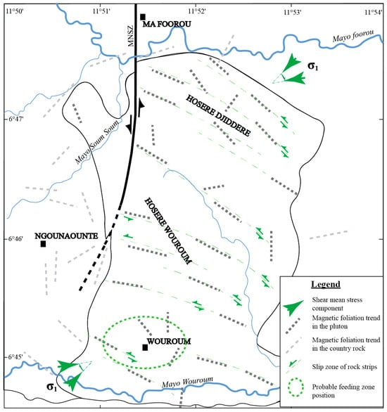 The organization of the magnetic foliation and lineation trends (Figure 16) in the whole pluton suggests a nearly NW-SE shearing in the rock strips in the sinistral sense of movement. In the southwestern part of the pluton, the concentration of steep-dip (73–86°) magnetic foliation allows us to suggest that the feeding conduit was not so far from there. The NW-SE-oriented direction of the magnetic lineation and foliation trends that regularly show moderate to steep dips and mostly low to very low plunges is evocative of the slip zone of the rock strips, while the NE-SW-oriented direction of the fabrics indicates the flow direction of the melt. This shows that, when deforming, the magma flowed parallel to the direction of the sub-horizontal magnetic lineation. As the direction of the magnetic foliation is parallel to that of the sub-horizontal magnetic lineation, we can conclude that parallelism between the fold axes and the direction of the stretching mineral lineation points to a low angle of active shear component deformation []. We then imagine that the direction of the mean shear stress component that induced the deformation of the pluton is thought to have been in the NE-SW to WNW-ENE direction (Figure 16).