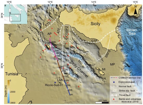 (a) Study area location; (b) structural map of Sicily Channel and the position of Riccio Sud-01 exploration well and multichannel seismic reflection profile CS89-01 (after [25,26,27]). Bathymetry data extracted from EMODnet (http://www.emodnet-bathymetry.eu/ (accessed on 18 March 2025)) DTM (2022). The white rectangle on the line between shot points 500 and 900 displays the position where the well is calibrated, with the depth converted to stratigraphic units. The main structural features are modified from [36]. AP: Adventure Plateau. ATF: Adventure Thrust Fault. CGSFZ: Capo Granitola–Sciacca Fault Zone. ETF: Egadi Thrust Fault. GTF: Gela Thrust Front. LG: Linosa Graben. LMI: Lampedusa Island. LI: Linosa Island. MG: Malta Graben. MI: Malta Island, PG: Pantelleria Graben. PI: Pantelleria Island. SRFS: Scicli–Ragusa Fault System.