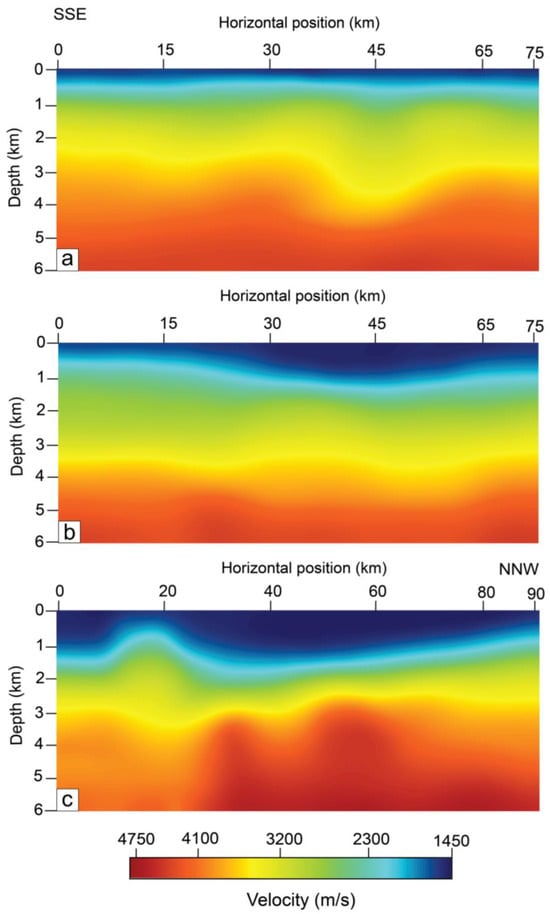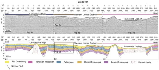 The CS89-01 profile crosses the Sicily Channel (Central Mediterranean Sea) from SSE to NNW, highlighting the stratigraphic and structural setting of the area at a regional scale and across various basins and sub-basins (Figure 1). Like many vintage seismic profiles, this is a scanned paper copy not available in digital format in any database, but it contains the complete suite of stacking velocities (Figure 2a–c) (for a detailed list of velocities, refer to Supplementary Material S1). Furthermore, this portion of the seismic profile is well known in the literature (Figure 2a’–c’; [25,26,27]). For the first time, its seismic interpretation is converted to depth from time, providing new insights into the geological setting down to 6 km depth in this sector of the Sicily Channel, which was intensively investigated in the past and recently [28,29,30,31,32,33,34,35,36,37].