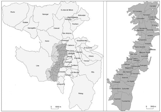 The DMQ with its 32 urban (right) and 33 rural (left) parishes.