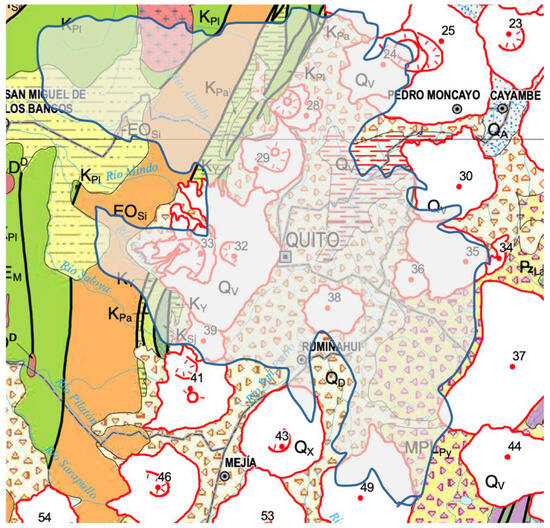 However, most of the DMQ consists of quaternary volcanic deposits (pumice, tuffs, lahars, lava flows, and debris avalanches) of formations such as Rio Pisque, San Miguel, and Chiche and different extinct, dormant, or active stratovolcanoes, calderas, and domes, besides some minor appearances of lagunar, glacial, alluvial, and colluvial deposits. Additionally, there are a variety of geological faults which crosscut the city and vast areas of unstable terrains which are prone to landslides [91,92,93,94,95,96] (Figure 3).